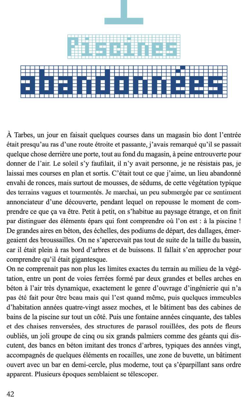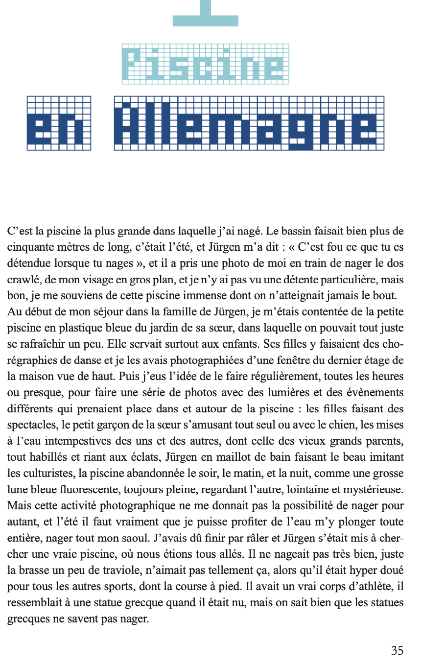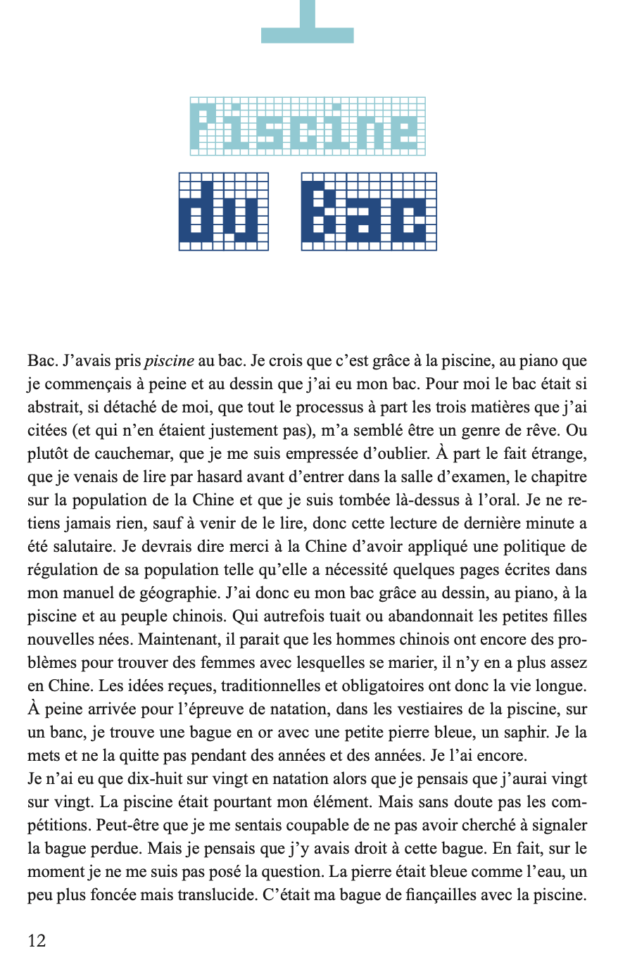 En parcourant le monde de piscine en piscine, Marianne Pascal cherche à comprendre ce qui a déterminé sa vie. Pourquoi ne saisit-elle la poésie des lieux qu’au travers de l’eau chlorée ? Pourquoi n’envisage-t-elle les relations humaines qu’au travers de l’eau bleu turquoise des bassins ? Quel événement a fixé pour toujours son lien avec les bains, petits ou grands ? De Paris au Liban, des États-Unis au sud-ouest, l’auteur nous entraîne aux sources de son histoire.