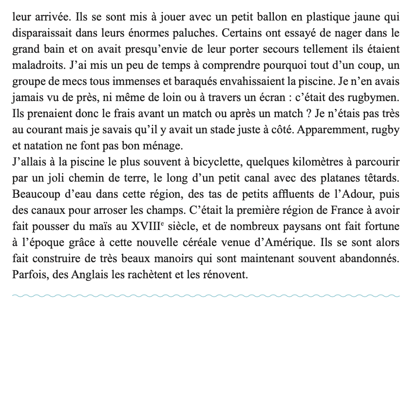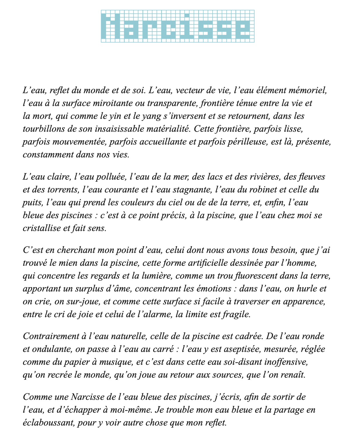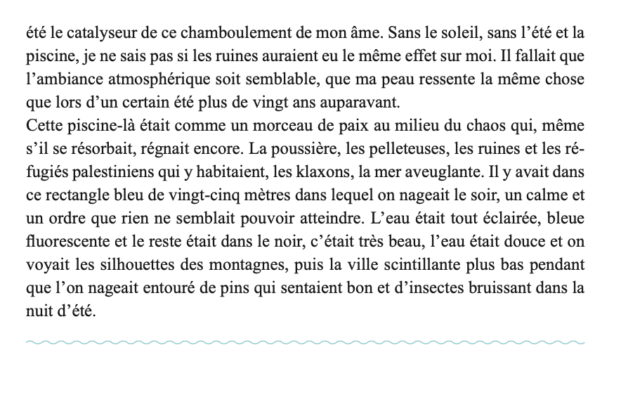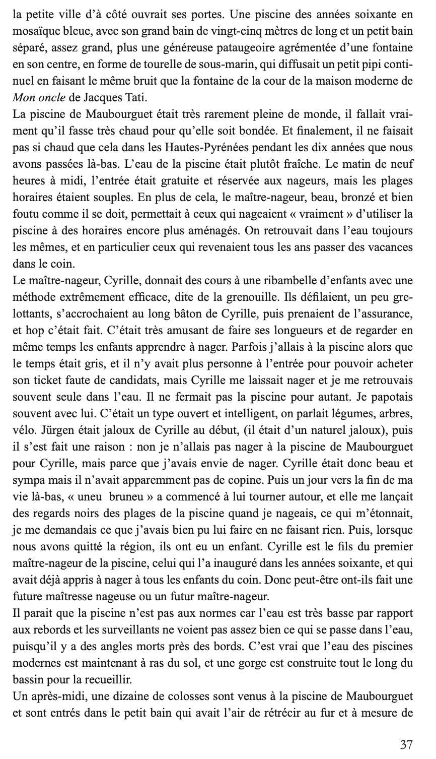 En parcourant le monde de piscine en piscine, Marianne Pascal cherche à comprendre ce qui a déterminé sa vie. Pourquoi ne saisit-elle la poésie des lieux qu’au travers de l’eau chlorée ? Pourquoi n’envisage-t-elle les relations humaines qu’au travers de l’eau bleu turquoise des bassins ? Quel événement a fixé pour toujours son lien avec les bains, petits ou grands ? De Paris au Liban, des États-Unis au sud-ouest, l’auteur nous entraîne aux sources de son histoire.